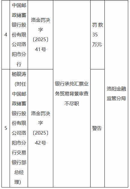 12月31日金融一线消息股票配资论坛,国家金融监督管理总局洛阳监管分局行政处罚信息公示显示,中国邮政储蓄银行股份有限公司洛阳市分行因银行承兑汇票业务贸易背景审查不尽职被罚35万元,杨银涛(时任中国邮政储蓄银行股份有限公司洛阳市分行交易银行部总经理)被给予警告。